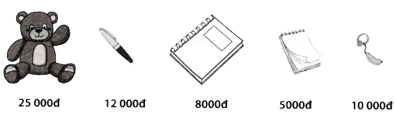 b) Bạn Huy mua một số đồ vật ở trên hết 30 000 đồng, các đồ vật đó có thể là một con gấu bông và một quyển số loại 5000 đồng một quyển hoặc 1 cái bút, 1 quyển sổ loại 8000 đồng 1 quyển và 1 cái móc treo chìa khóa.
