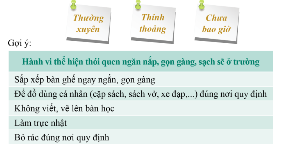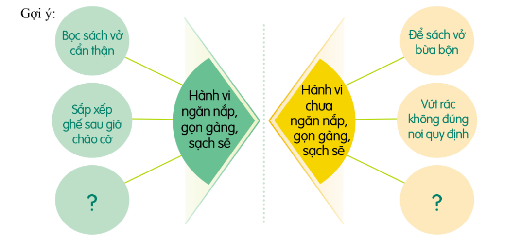 * Chia sẻ những hành vi thể hiện và không thể hiện sự ngăn nắp, gọn gàng, sạch sẽ của học sinh trong các hoạt động của nhà trường.