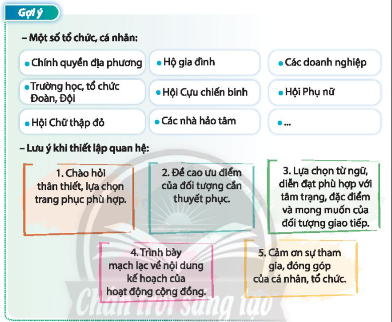 Thiết lập quan hệ với các tổ chức, cá nhân có thể tham gia hoạt động xã hội.