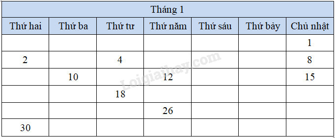 Viết các ngày còn thiếu trong tháng 1 của tờ lịch dưới đây:
