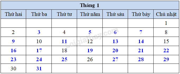 c) Tháng 1 có 5 ngày chủ nhật. Đó là các ngày: 1; 8; 15; 22; 29.
