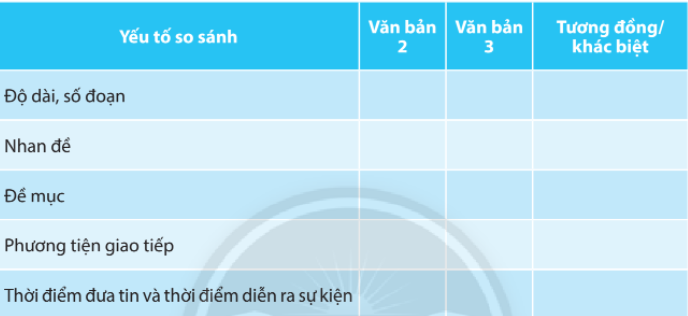 Hoàn thành bảng so sánh dưới đây (làm vào vở), chỉ ra một số điểm tương đồng, khác biệt (nếu có) giữa văn bản 2 và văn bản 3.