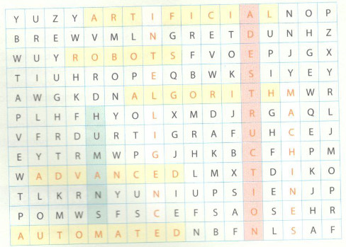 Task 1. Find in the word square the following words: humans, destruction, artificial, intelligence machines, robots, advanced, automated, algorithm. (Tìm trong ô vuông những từ sau đây: humans, destruction, artificial, intelligence machines, robots, advanced, automated, algorithm. )