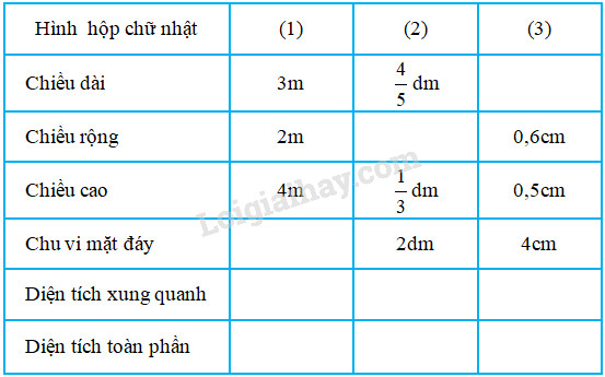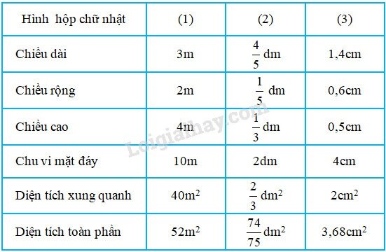 b) Chiều dài \( \displaystyle {4 \over 5}dm\) , chiều rộng \( \displaystyle {1 \over 3}dm\) , chiều cao \( \displaystyle {3 \over 4}dm\).