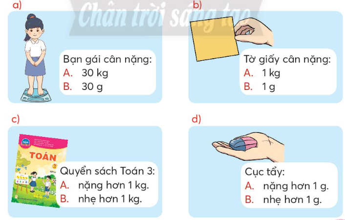 Quan sát tranh và khoanh vào g hay kg cho thích hợp.