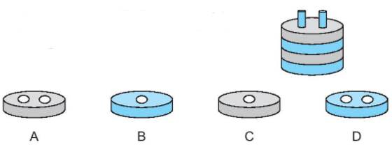 Quan sát hình ta thấy, các khối dạng hình trụ được xếp xem kẽ: màu xanh, màu xám, màu xanh, … Do đó khối trụ trên cùng có màu xanh.