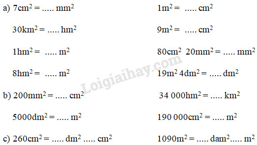 Giải bài tập 1, 2, 3 trang 34 VBT toán 5 bài 25 : Mi-li-mét vuông. Bảng đơn vị đo diện tích với lời giải chi tiết và cách giải nhanh, ngắn nhất