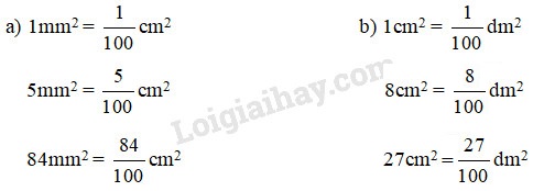 1dm2 = 100cm2 hay 1cm2 = \( \displaystyle {1 \over {100}}\)dm2 .