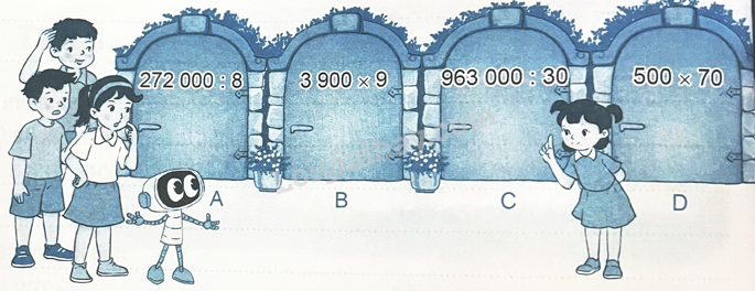 Mi đã đặt một món quà sau ô cửa ghi phép tính có kết quả lớn nhất. Mai, Việt, Nam và Rô-bốt theo thứ tự đi vào các ô cửa A, B, C, D. Hỏi bạn nào nhận được món quà của Mi?