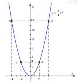 Khi đó đồ thị hàm số đã cho  là 1 đường cong và đi qua các điểm \(A\left( {2;3} \right);B\left( {4;12} \right);C\left( { – 2;3} \right);D\left( { – 4;12} \right);O\left( {0;0} \right)\)
