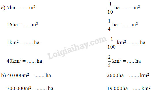 Áp dụng cách đổi: 1ha = 1hm2 ; 1km= 100hm= 100ha ;  1ha = 10 000m2