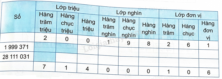 – Xác định hàng của mỗi chữ số rồi điền số thích hợp vào bảng.