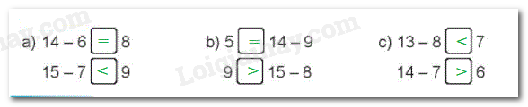 Tính nhẩm kết quả phép trừ và so sánh với vế còn lại rồi điền dấu vào ô trống cho thích hợp.