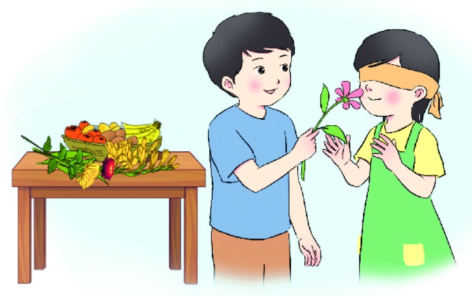 Em sử dụng khứu giác (dùng mũi ngửi) hoặc xúc giác (dùng tay sờ) để đoán đoán các loài hoa hoặc các loại quả.