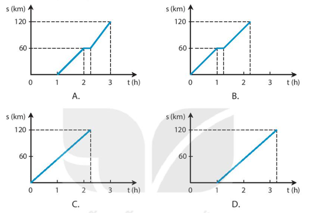 Lúc 1h sáng, một đoàn tảu hỏa chạy từ ga A đến ga B với tốc độ 60 km/h, đến ga B lúc 2h và dừng ở ga B 15 phút. Sau đó đoàn tàu tiếp tục chạy với vận tốc cũ thì đến ga C lúc 3h15 phút. Hình vẽ nào sau đây biểu diễn đúng đồ thị quãng đường – thời gian của đoàn tàu nói trên?