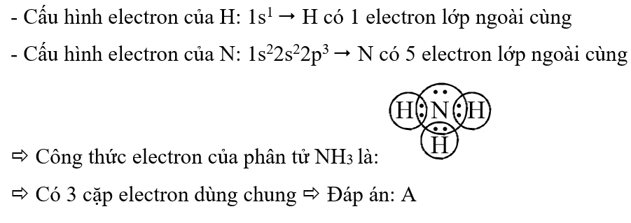 Trong phân tử ammonia (NH3), số cặp electron chung giữa nguyên tử nitrogen và các nguyên tử hydrogen là