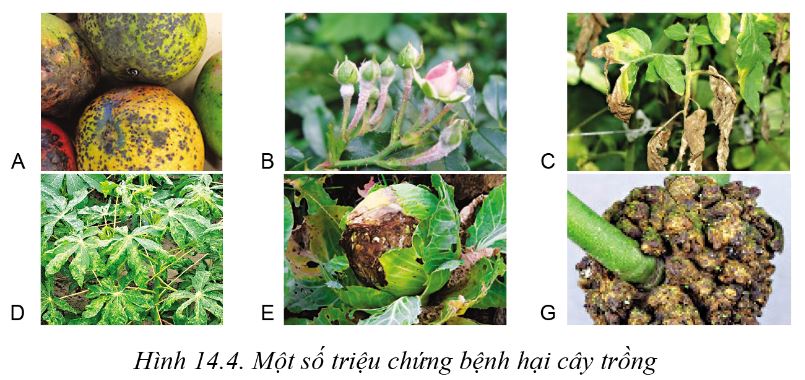 Quan sát Hình 14.4 và chỉ ra những triệu chứng bệnh hại cây trồng điển hình.