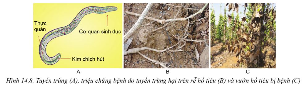 Quan sát Hình 14.8 và mô tả đặc điểm cấu tạo của tuyến trùng, triệu chứng của bệnh tuyến trùng hại cây hồ tiêu.