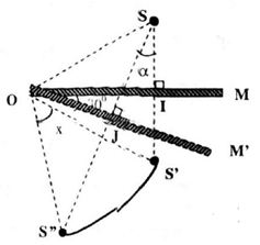 Như vậy, khi cho gương quay một góc \(\alpha \) quanh O thì ảnh S di chuyển trên cung \(S’S”\) bán kính bằng OS và đoạn đường OS’ quay được một góc x như hình