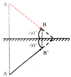 Một vật sáng AB đặt trước gương phẳng như hình. Góc tạo bởi vật và mặt gương bằng \({60^0}\). Góc tạo bởi ảnh và mặt gương là: