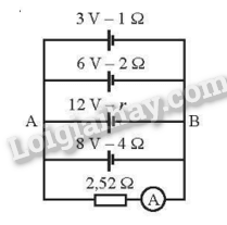 Gọi suất điện động và điện trở trong mỗi nguồn là và r nên suất điện động và điện trở trong của bộ nguồn tương ứng là 4E và 4r.