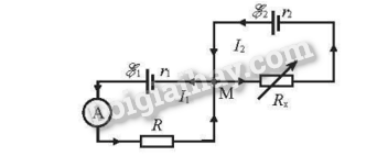 Áp dụng định luật Ohm cho mỗi vòng kín, ta có: \({I_1} = \frac{{{{\rm{E}}_1}}}{{R + {r_1}}};{I_2} = \frac{{\rm{E}}}{{{R_x} + {r_2}}}\). Như vậy số chỉ ampe kế A (dòng I1) không phụ thuộc vào giá trị Rx.