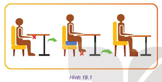 Hình 19.1 là các bộ bàn, ghế được thiết kế để ngồi làm việc. Hãy quan sát và chỉ ra những điểm bất hợp lí trong từng hình và thử đề xuất điều chỉnh cho thiết kế phù hợp hơn với người ngồi.