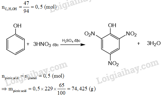 Picric acid (2,4,6-trinitrophenol) trước đây được sử dụng làm thuốc nổ. Để tồng hợp picric acid, người ta cho 47g phenol phản ứng với hỗn hợp HNO3 đặc/ H2SO4 đặc, dư. Tính khối lượng picric acid thu được, biết hiệu suất phản ứng là 65%.