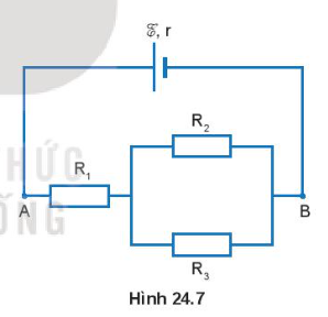 Cho mạch điện như Hình 24.7. Các giá trị điện trở R1 = 20Ω, R2 = 4Ω và R3 = 6Ω. Suất điện động của nguồn ξ = 12V, điện trở trong của nguồn r = 0,6 Ω.