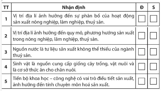 Những nhận định sau đây về các nhân tố ảnh hưởng tới phát triển và phân bố nông nghiệp, lâm nghiệp, thủy sản là đúng (Đ) hay sai (S)? Hãy đánh dấu (X) vào các ô tương ứng bên cạnh mỗi nhận định