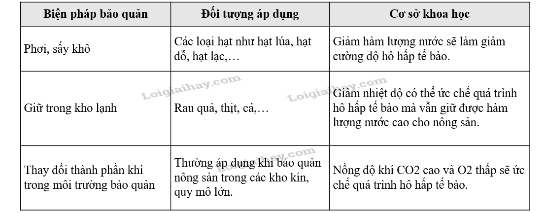 Để bảo quản nông sản, cần điều chỉnh các yếu tố nước, nhiệt độ, nồng độ khí carbon dioxide để đưa cường độ hô hấp về mức tối thiểu: