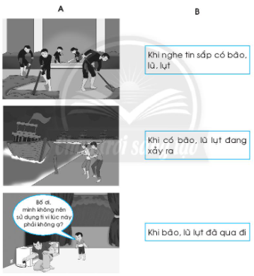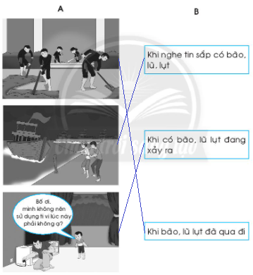 1. Nối các việc làm ở cột A với thời gian thực hiện phù hợp ở cột B. 2. Quan sát hình gợi ý và viết vào chỗ (…) dưới mỗi hình chỉ những việc gia đình em nên làm khi nghe tin sắp có bão xảy ra. 3. Viết vào chỗ (…) cách ứng xử của em trong tình huống sau. Nếu có mặt trong tình huống trên, em sẽ: … 4. Tìm và tô màu đường đi giúp gia đình bạn Tú đến được nơi an toàn khi có lũ.
