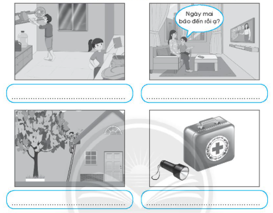 2. Quan sát hình gợi ý và viết vào chỗ (…) dưới mỗi hình chỉ những việc gia đình em nên làm khi nghe tin sắp có bão xảy ra.