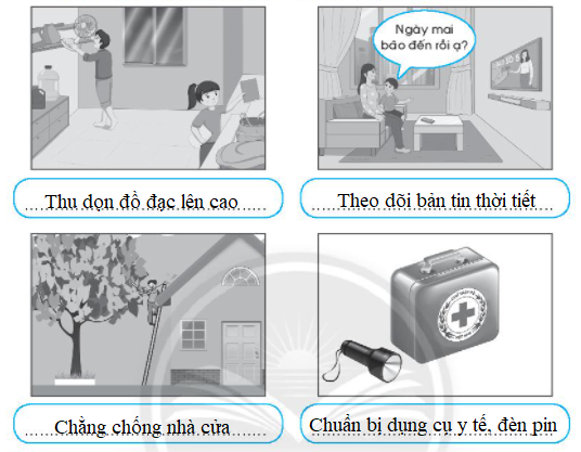 Quan sát hình gợi ý và viết vào chỗ (…) dưới mỗi hình chỉ những việc gia đình em nên làm khi nghe tin sắp có bão xảy ra.