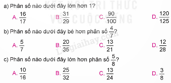 b) Các phân số viết theo thứ tự từ lớn đến bé là: $\frac{{20}}{{16}};\,\,\frac{{19}}{{24}};\,\,\frac{3}{4};\,\,\frac{7}{{12}}$