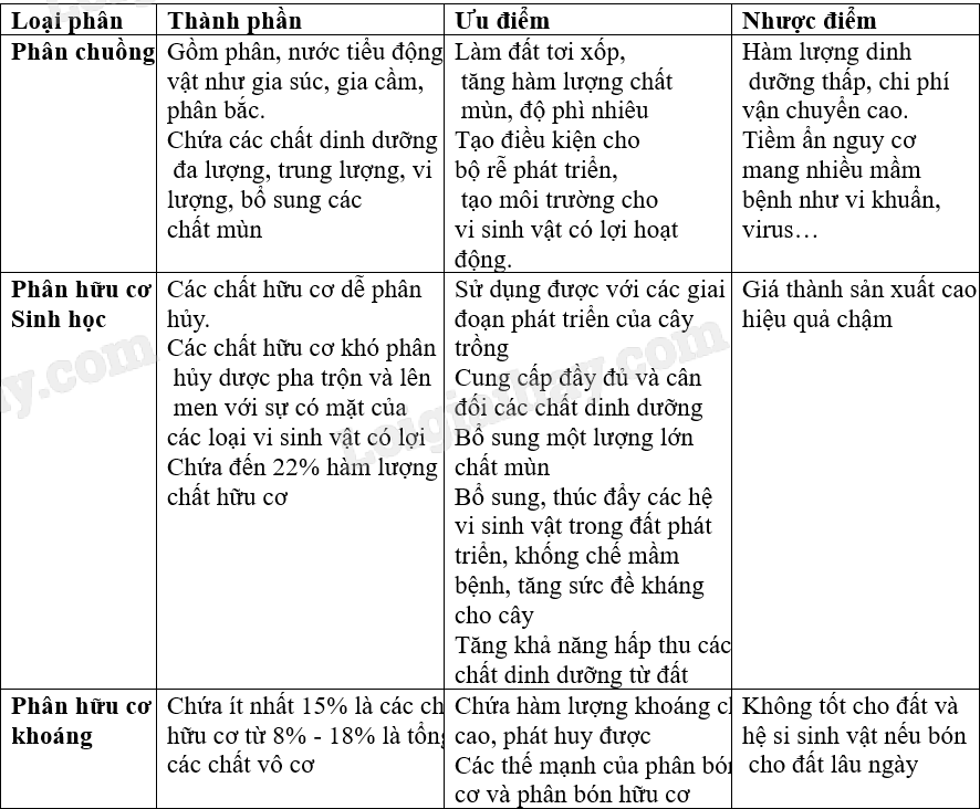 So sánh thành phần và ưu nhược điểm của ba loại phân bón là phân chuồng, hữu cơ sinh học và phân hữu cơ khoảng