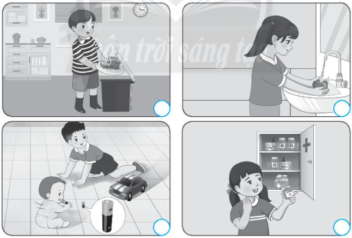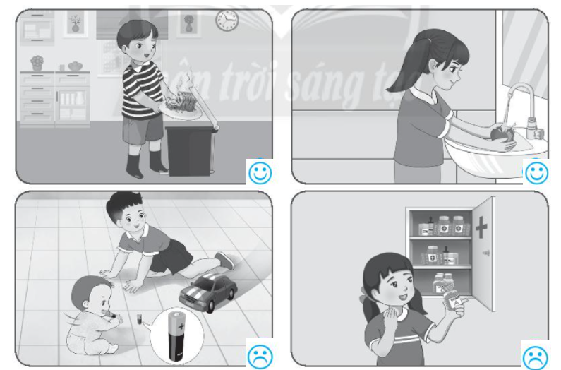 Em quan sát kĩ các hình ảnh để xem các bạn nhỏ trong hình vẽ gì? Hành động đó có nguy hiểm hay không?