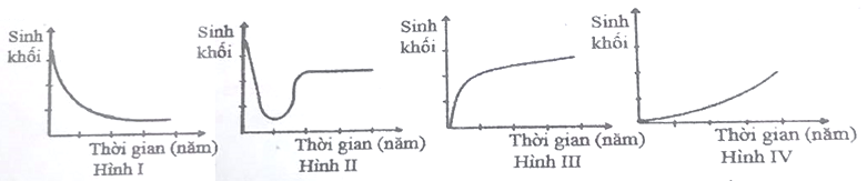 Giả sử sự thay đổi sinh khối trong quá trình diễn thế sinh thái của 4 quần xã sinh vật được mô tả ở các hình I; II; III và IV.