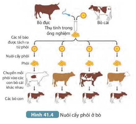 – Nuôi cấy phôi ở bò: Người ta dùng hormone kích thích trứng chín và rụng, cho trứng đó thụ tinh với tinh trùng trong ống nghiệm để phát triển thành phôi, tùy từng đối tượng mà người ta đem cấy ngay phôi đó vào tử cung con cái hoặc tách phôi thành nhiều phần, mỗi phần phát triển thành một phôi mới rồi cấy vào tử cung của các con cái để tạo ra số lượng con lớn.