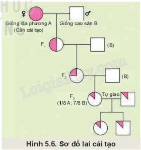 Con cái của giống địa phương lai giống với con đực giống cao sản, tạo ra thế hệ F1 mang đặc tính của cả bố và mẹ với tỉ lệ giống địa phương : giống cao sản là 1/2:1/2. Tiếp tục lai giống con cái F1 với con đực giống cao sản tạo ra thế hệ F2 với tỉ lệ giống địa phương : giống cao sản là 1/4:3/4. Tiếp tục lai giống con cái F2 với con đực giống cao sản tạo ra thế hệ F3 với tỉ lệ giống địa phương : giống cao sản là 1/8:7/8. Cho con đực và con cái thuộc thế hệ F3 tự giao nhau, vẫn tạo ra con với tỉ lệ giống địa phương : giống cao sản là 1/8:7/8.