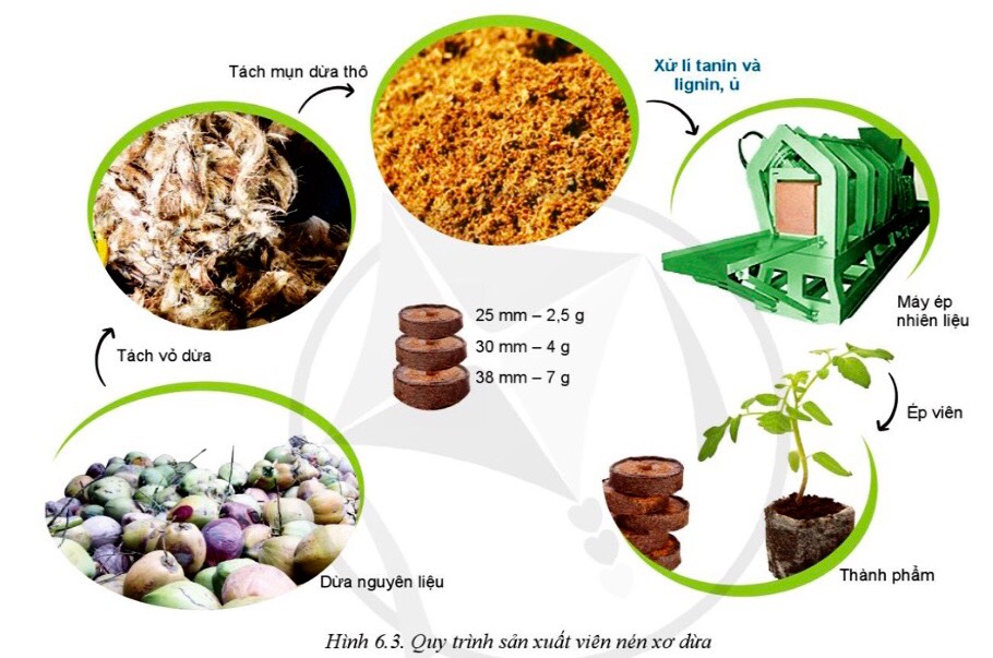 Quan sát Hình 6.3 và nêu quy trình sản xuất giá thể xơ dừa: