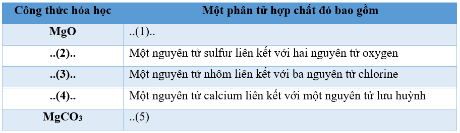Điền công thức hóa học và mô tả số lượng các nguyên tử của các nguyên tố vào chỗ trống để hoàn thiện bảng sau: