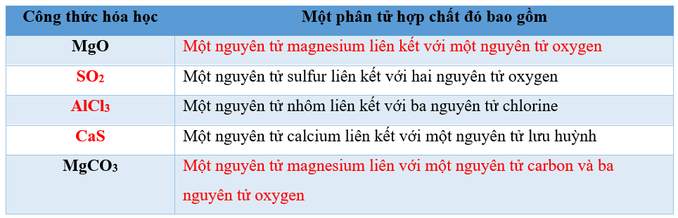+ Công thức hóa học của hợp chất gồm kí hiệu hóa học của những nguyên tố tạo nên hợp chất kèm theo chỉ số ở chân bên phải của kí hiệu hóa học. Chỉ số là những số nguyên, cho biết số nguyên tử của mỗi nguyên tố trong phân tử hợp chất. Chỉ số bằng 1 thì không ghi.