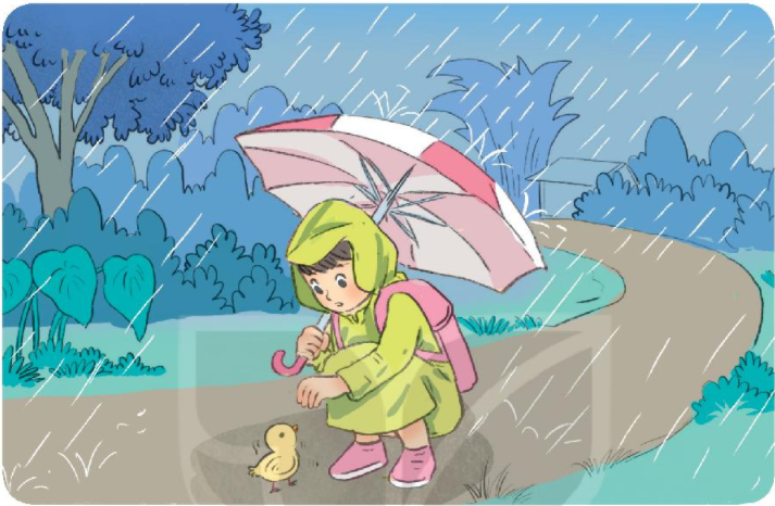 Hôm nay tan học, mẹ bận việc cơ quan không đón em được. Vì nhà gần trường học nên em có thể tự đi về. Trên đường về gặp trận mưa rào, bên những bụi cỏ gần vệ đường, em bắt gặp một chú gà con bị lạc mẹ, và đi lang thang một mình dưới mưa, trông chú rất tội nghiệp. Thấy thế, em liền mở ô ra che cho gà con không bị ướt. Em cùng gà con đi xung quanh để kiếm lại mẹ cho nó. Thật may, gà mẹ trú mưa dưới tán cây gần đó, chú gà con mừng rỡ gọi “Chíp chíp” như một lời cảm ơn dành cho em. Về nhà em đã kể lại sự việc cho mẹ nghe và được mẹ khen là một đứa trẻ ngoan. Me căn dặn em phải luôn yêu quý động vật quanh ta.