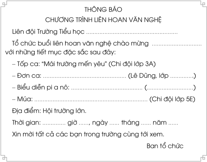 Viết từ ngữ phù hợp vào chỗ trống để hoàn thành thông báo dưới đây. Viết đoạn văn kể về một buổi biểu diễn nghệ thuật (hoặc chiếu phim) mà em đã được xem.