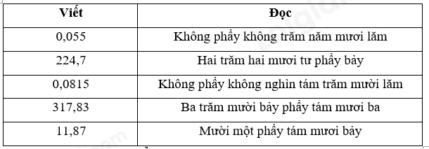 b) Hãy ghi lại các số thập phân và cách đọc vào bảng sau: