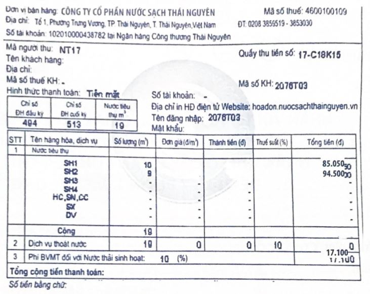 Đọc thông tin trên hóa đơn thu tiền nước và trả lời câu hỏi: