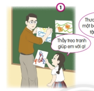Bạn nữ nhờ thầy giáo treo giúp tranh nhưng lại đưa bằng một tay. Bạn chưa lễ phép với thầy, chưa thể hiện sự kính trọng thầy giáo.
