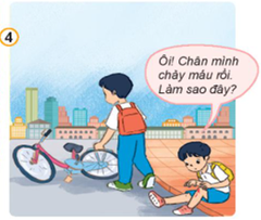 Bạn nam bị ngã xe và chân chả máu. Bạn nam nên nhờ lịch sự người bạn đi cùng hoặc những người lớn gần đấy giúp đỡ đưa đến hiệu thuốc gần nhất để được băng bó vết thương, tránh vết thương bị nặng hơn.