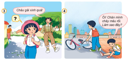 Bạn nam bị ngã xe và chân chả máu. Bạn nam nên nhờ lịch sự người bạn đi cùng hoặc những người lớn gần đấy giúp đỡ đưa đến hiệu thuốc gần nhất để được băng bó vết thương, tránh vết thương bị nặng hơn.